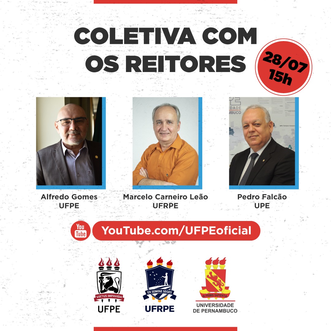 Os reitores da Universidade Federal Rural de Pernambuco (UFRPE), Marcelo Carneiro Leão; da Universidade Federal de Pernambuco (UFPE), Alfredo Gomes; e da Universidade de Pernambuco (UPE), Pedro Falcão, convidam a imprensa para coletiva a ser realizada nesta terça-feira (28/07), às 15h, no Auditório João Alfredo, localizado no 1º andar da Reitoria da UFPE.