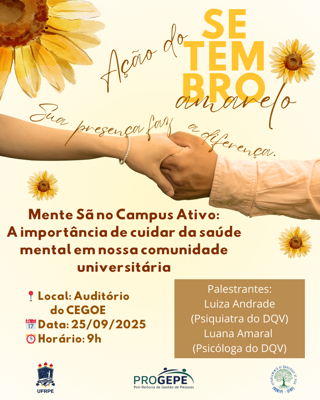 Em alusão ao Setembro Amarelo, a equipe do Departamento de Qualidade Vida (DQV/PROGEPE/UFRPE) convida toda a comunidade universitária para um momento de reflexão e diálogo sobre saúde mental no ambiente acadêmico.