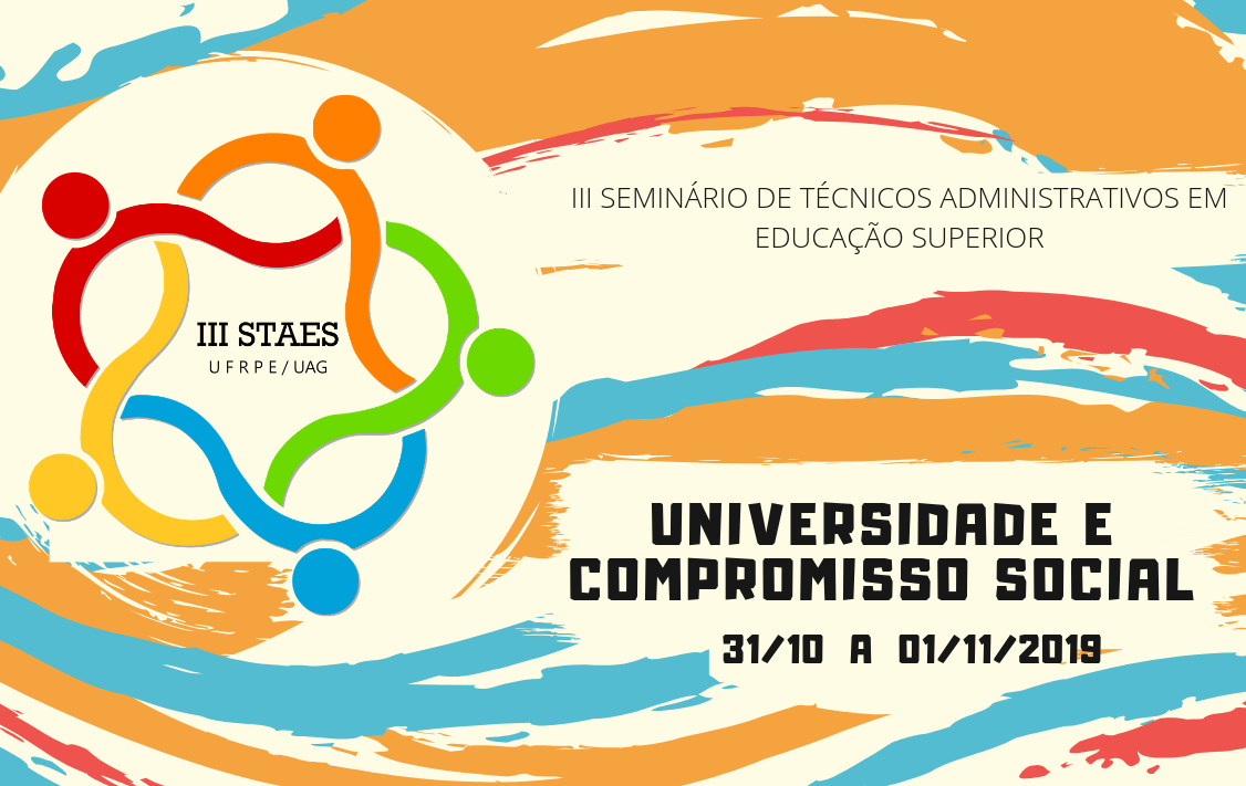A Unidade Acadêmica de Garanhuns da Universidade Federal Rural de Pernambuco (UAG/UFRPE) realiza, entre os dias 31 de outubro e 01 de novembro, o III Seminário de Técnicos Administrativos em Educação Superior (STAES) e tem como tema "Universidade e Compromisso Social". Período de inscrição: COM ou SEM submissão de resumos - 02/09/2019 a 30/09/2019. Os interessados podem se inscrever, com ou sem submissão de resumos, entre os dias 02/09/2019 a 30/09/2019.