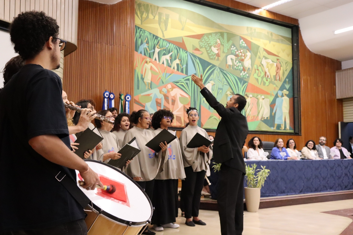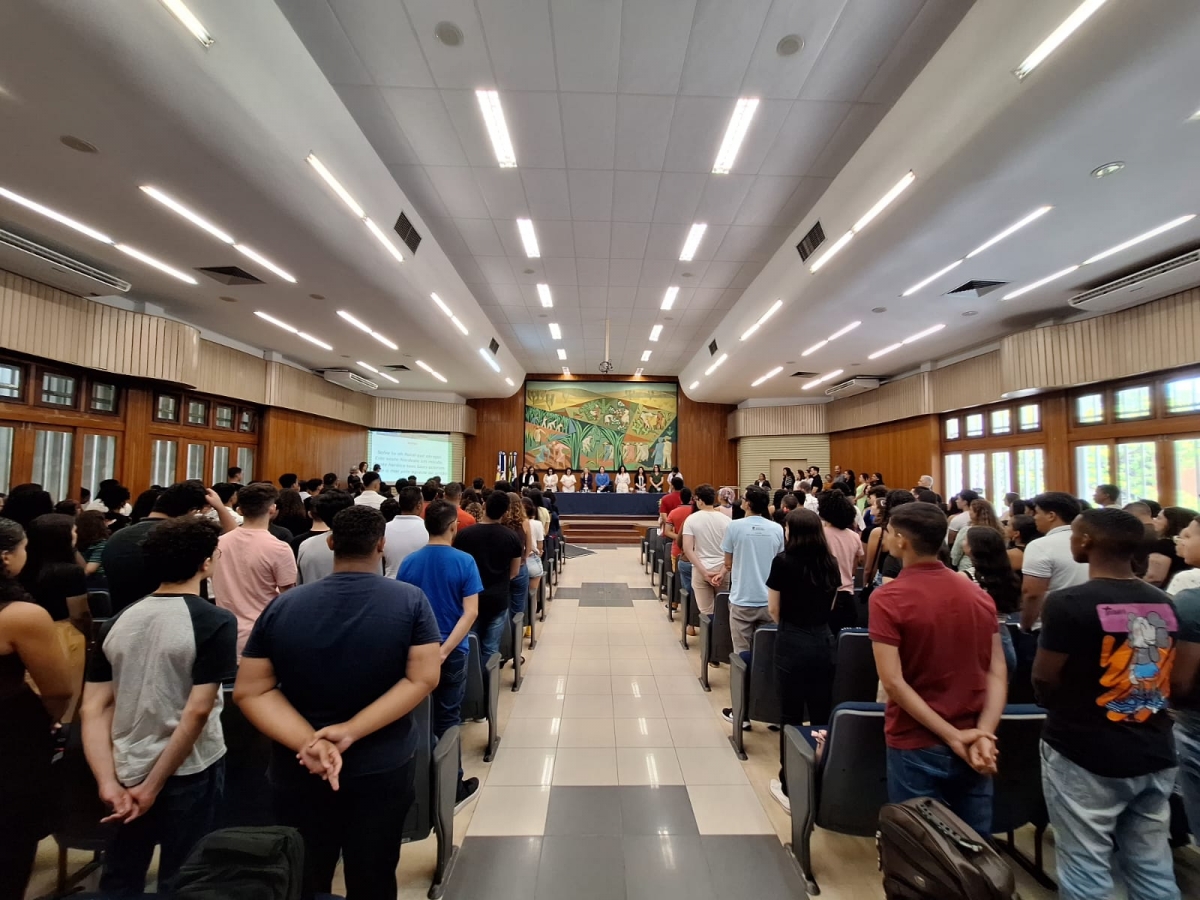 A Universidade Federal Rural de Pernambuco realizou nesta terça-feira(29/10), em um Salão Nobre lotado, as aulas inaugurais dos cursos de graduação presenciais do semestre 2024.2. A cerimônia, que aconteceu pela manhã (9h), à tarde (14h) e à noite (19h), contou com apresentação do Coro Universitário, que agraciou os presentes com três peças. Participaram da mesa solene a reitora da UFRPE, Maria José de Sena, a vice-reitora, Maria do Socorro de Lima Oliveira, além de Pró-Reitores e de representante dos estudantes.