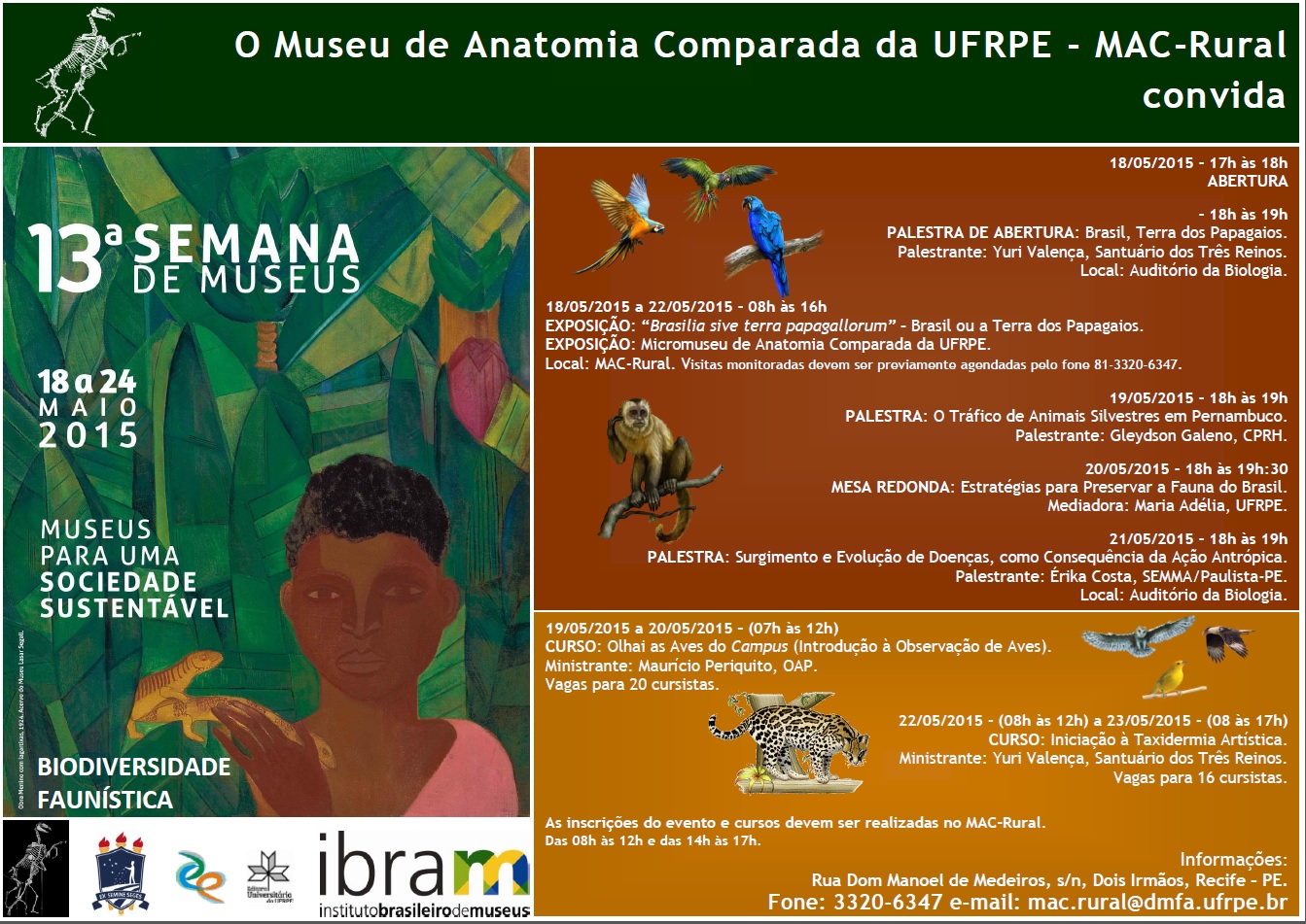 A equipe do Museu de Anatomia Comparada (MAC) da UFRPE convida a comunidade para participar da programação referente à 13ª Semana de Museus. O evento, organizado pelo Instituto Brasileiro de Museus (Ibran), acontece em museus de todo país. Na UFRPE, o MAC organizou palestras, mesas-redondas, curso, exposição e diversas atividades para celebrar o evento, com o tema Biodiversidade Faunística. A Semana acontece de 13 a 24 de maio, com programação de 18 a 22/05 no campus Dois Irmãos.