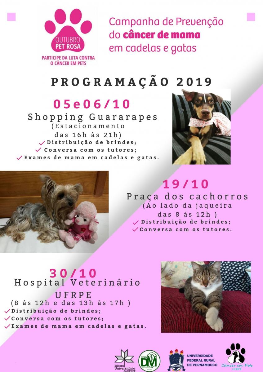 Com o intuito de estreitar relações entre academia e população, o projeto de extensão Câncer em Pets UFRPE realiza, durante o mês de Outubro, a 5ª edição do Outubro Pet rosa. A ação desenvolvida dentro da universidade ganha as ruas do Recife e RMR para instruir e conscientizar os tutores de cadelas e gatas sobre os riscos do câncer de mama. Neste ano, as atividades serão realizadas em três pontos: no Shopping Guararapes , em Piedade (05 e 06/10); na Praça dos Cachorros, Jaqueira (19/10); e por fim, no Hospital Veterinário da UFRPE (30/10). Também há uma ação prevista para Garanhuns, no dia 25 deste mês.