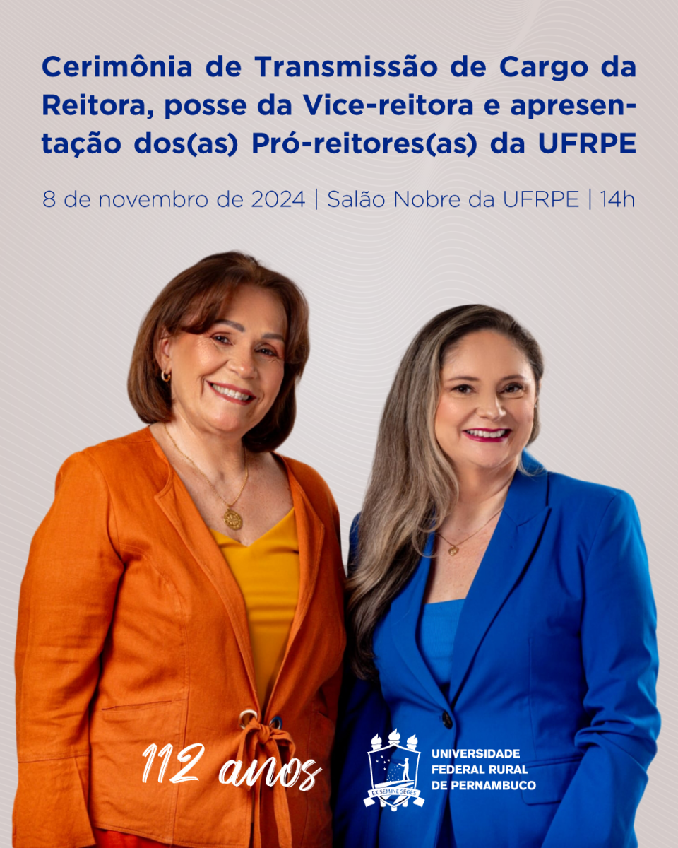 Na próxima sexta-feira (08/11), no Salão Nobre da Universidade Federal Rural de Pernambuco (UFRPE), às 14h, será realizada a Solenidade de Transmissão de Cargo da professora  Maria José de Sena, eleita em 2023, para quatro anos de mandato da Administração Superior da UFRPE. O evento também dará posse a professora Maria do Socorro de Lima Oliveira no cargo de vice-reitora. A Solenidade será presidida pelo professor Gabriel Rivas, vice-reitor da UFRPE(2020-2024). O evento será transmitido pelo canal do Youtube da UFRPE