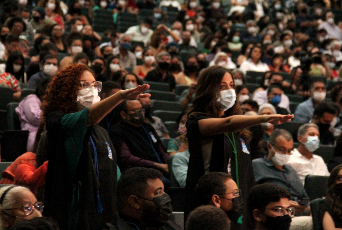 "Para além da importância que uma solenidade de Colação de Grau possui, com a outorga do grau superior aos novos profissionais que estão se formando, essa cerimônia de hoje tem um significado muito especial para mim. É uma celebração da vida, da resistência das universidades, da defesa da Ciência, da importância do Ensino Superior", destacou o reitor Marcelo Brito Carneiro Leão.