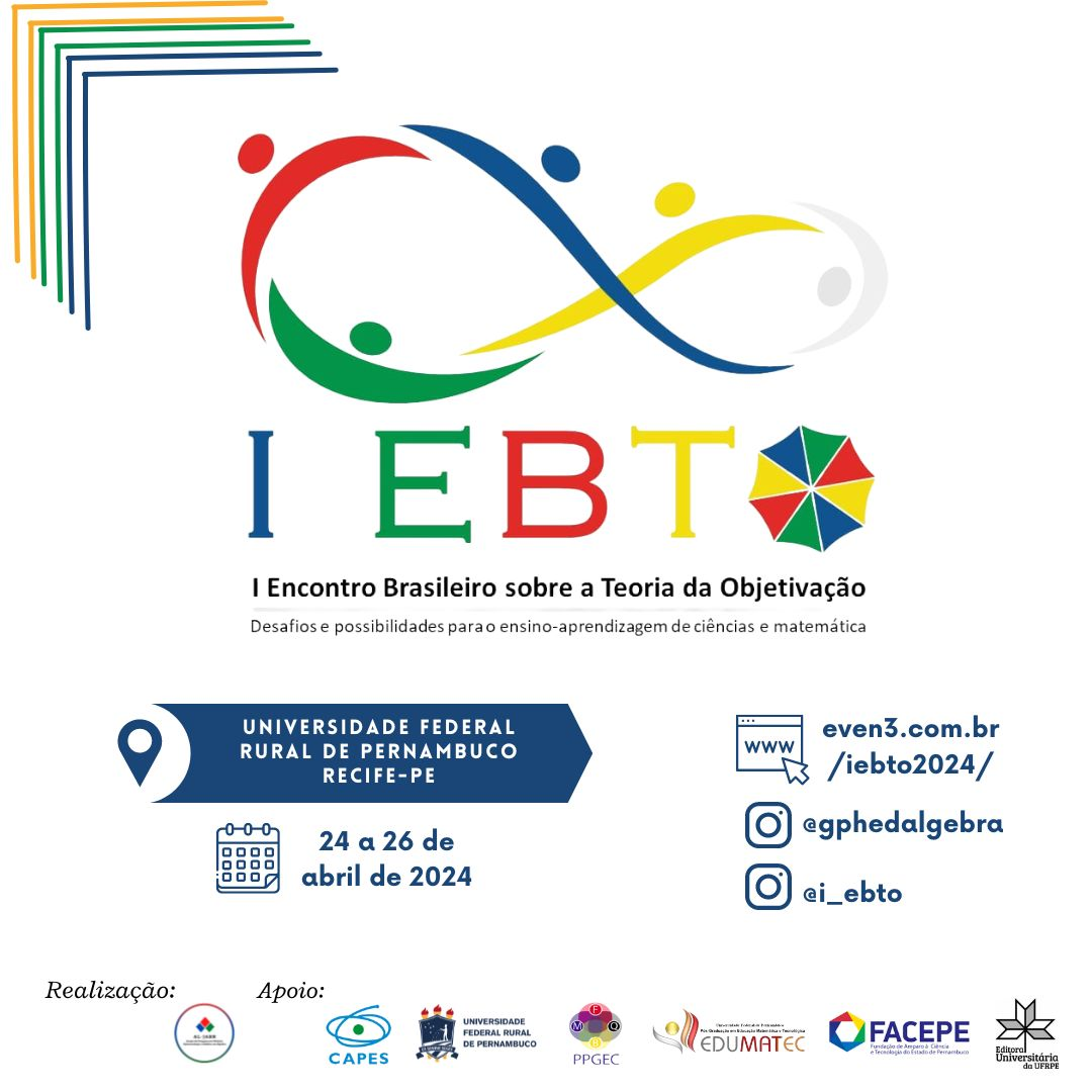 A  Universidade Federal Rural de Pernambuco (UFRPE) recebe, entre os dias 24 a 26 de abril de 2024, o I Encontro Brasileiro sobre a Teoria da Objetivação (EBTO). O evento visa reunir a comunidade acadêmica (pesquisadores, professores e estudantes) interessada em discutir, ampliar e divulgar os conhecimentos científicos acerca da temática proposta. Esta primeira edição está centrada em refletir acerca dos "Desafios e possibilidades para o ensino-aprendizagem de ciências e matemática", aspirando não apenas os fundamentos de dimensão teórica como também as aplicações da teoria para práticas pedagógicas contemporâneas, plurais, democráticas, críticas e inovadoras.