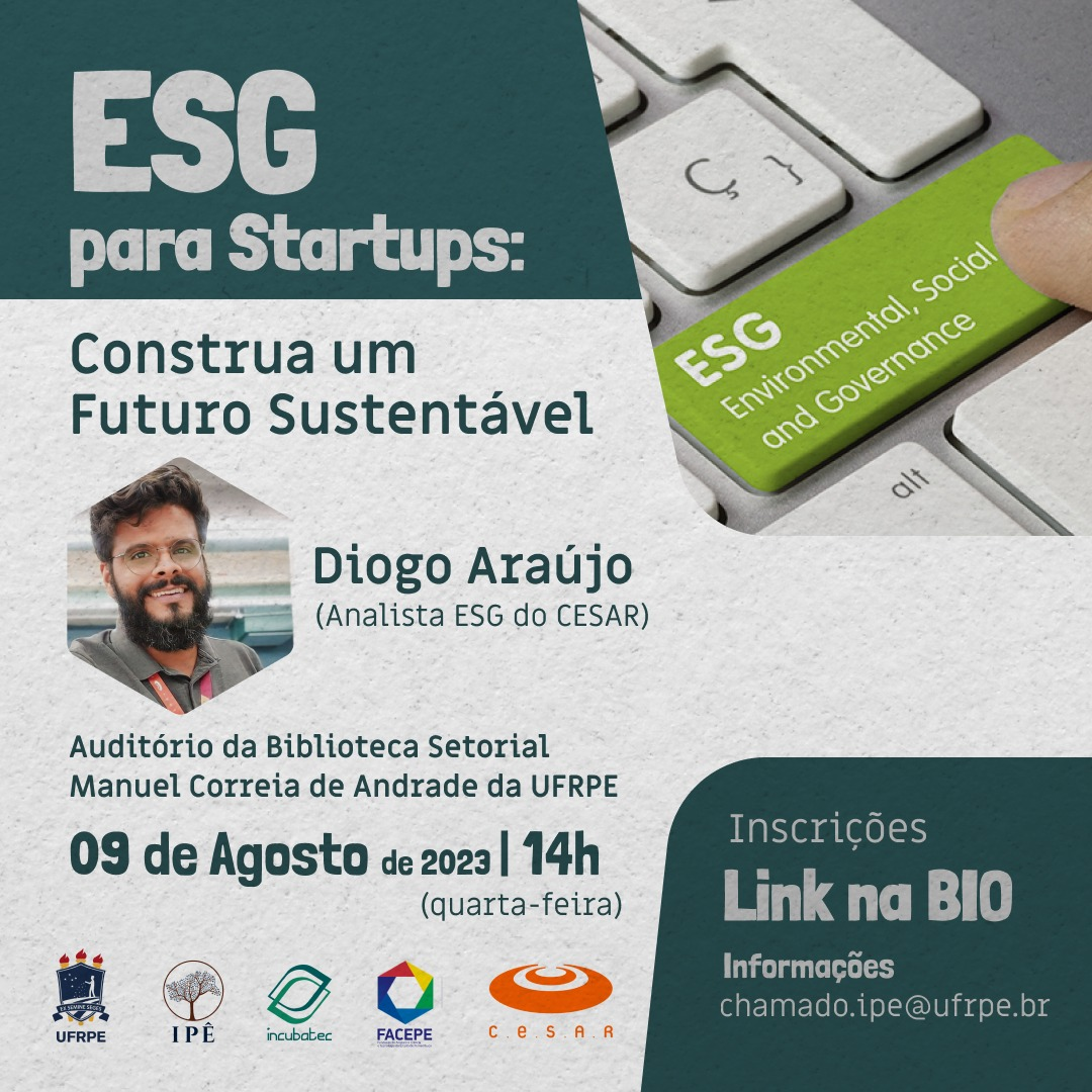 A Incubatec - NEI - Instituto IPÊ receberá o analista de ESG do C.E.S.A.R., Diogo Araújo para conversar sobre ESG para Startups | Construa um Futuro Sustentável. O evento será dia 09 de agosto às 14h no Auditório da Biblioteca Setorial da UFRPE.