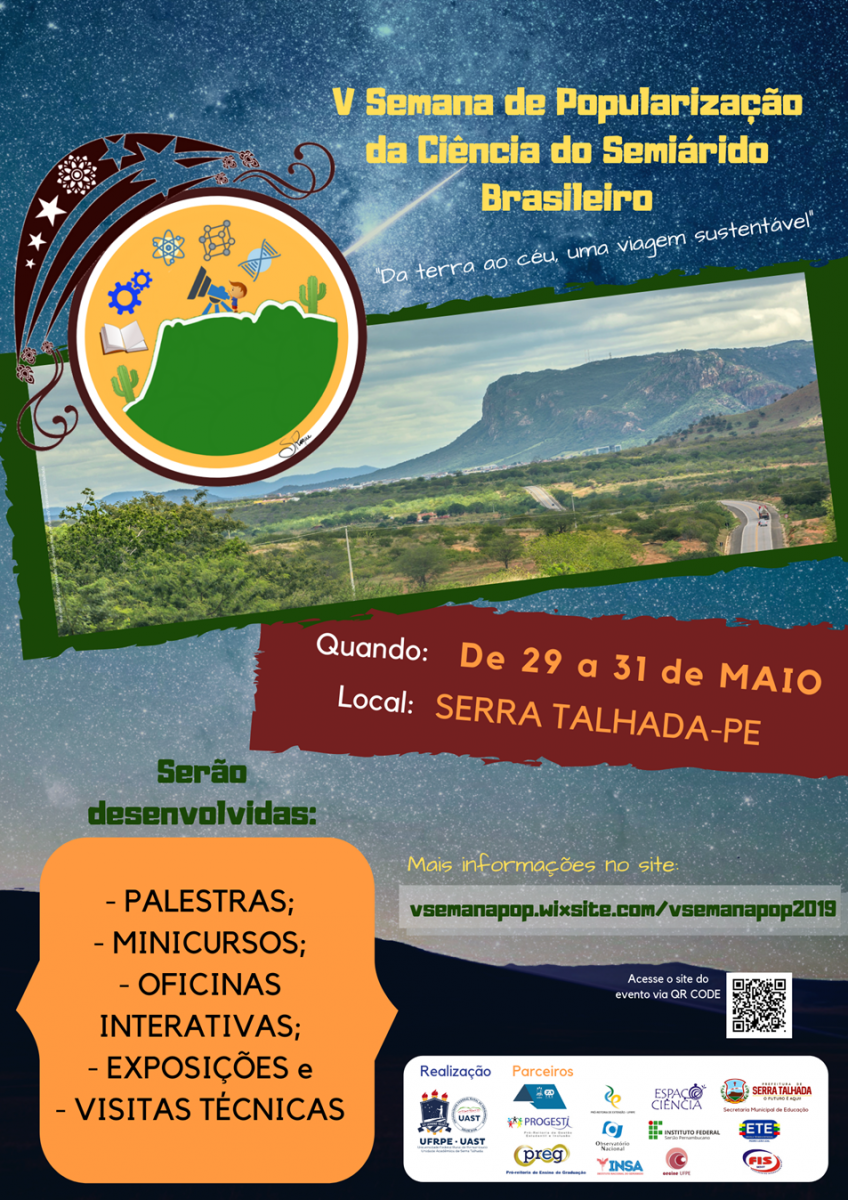 Estão abertas as inscrições para a V Semana de Popularização da Ciência do Semiárido Brasileiro. As inscrições são gratuitas e o evento será realizado entre os dias 29 e 31 de maio no município de Serra Talhada.