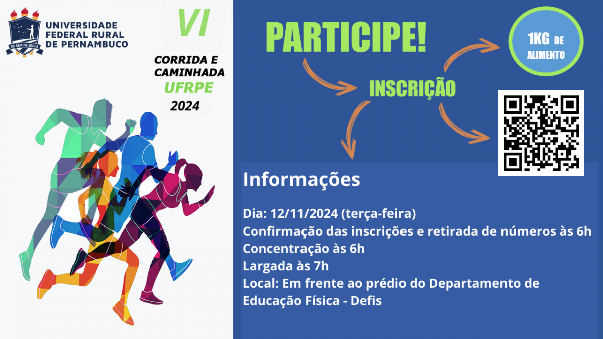Acontece, no próximo dia 12/11, em frente ao Departamento de Educação Física, a VI corrida e caminhada da UFRPE. O evento faz parte das comemorações dos 112 anos da instituição e é aguardada ansiosamente pela comunidade acadêmica. Promovida pelo Departamento de Educação Física, a sexta edição do evento contará com corrida de 5km (masculino e feminino) nas categorias adulto (acima de 17 anos) e máster (acima de 40 anos) para pessoas com e sem deficiência. Durante o evento também será realizada a caminhada de 3km. Estudantes, professores, corpo técnico administrativo, prestadores de serviços e comunidade circunvizinha poderão participar gratuitamente mediante doação de 1kg de alimento não perecível, que será doado para instituições de caridade.