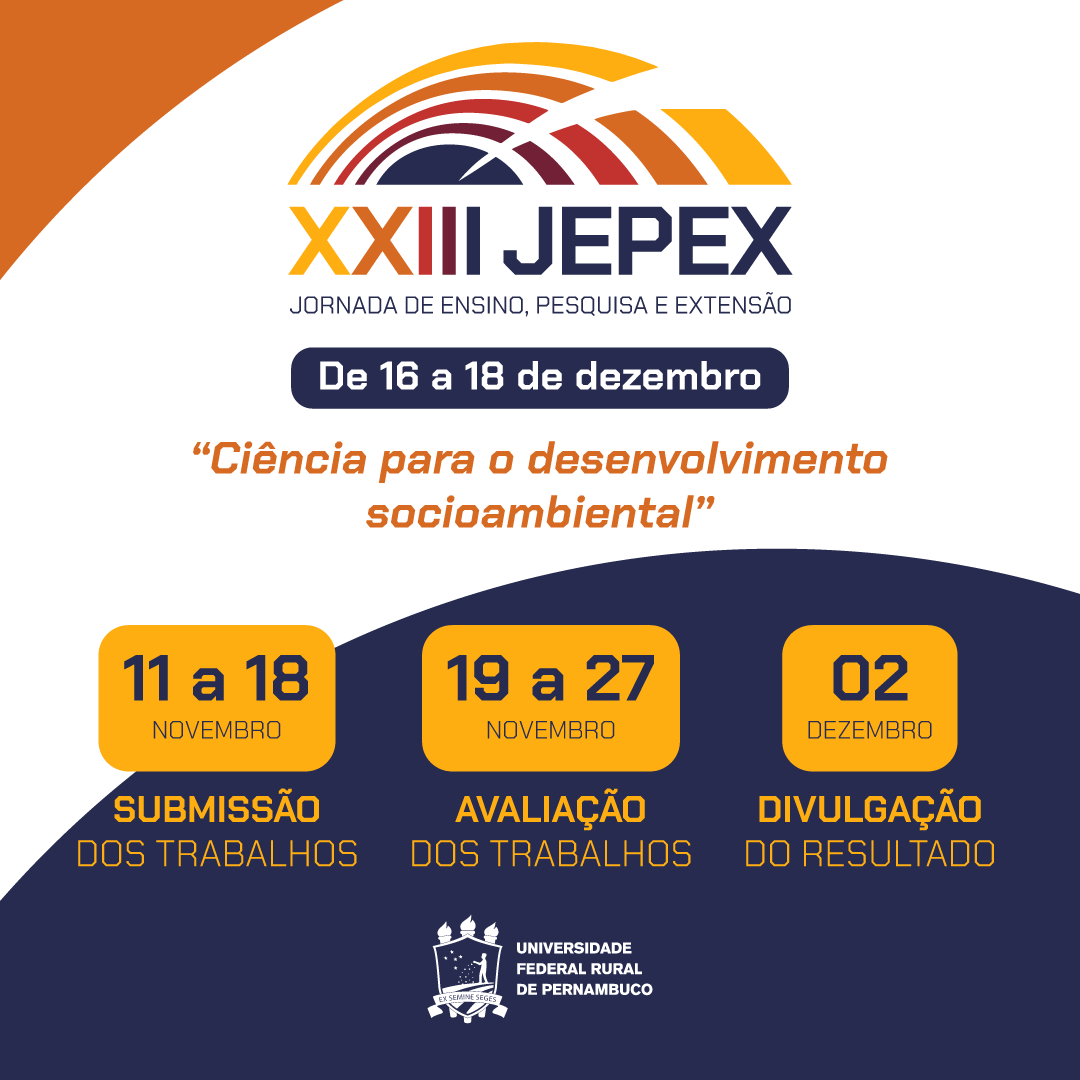 A Universidade Federal Rural de Pernambuco (UFRPE) realizará a XXIII Jornada de Ensino, Pesquisa e Extensão (JEPEX) entre os dias 16 e 18 de dezembro de 2024, com o tema "Ciência para o Desenvolvimento Socioambiental".