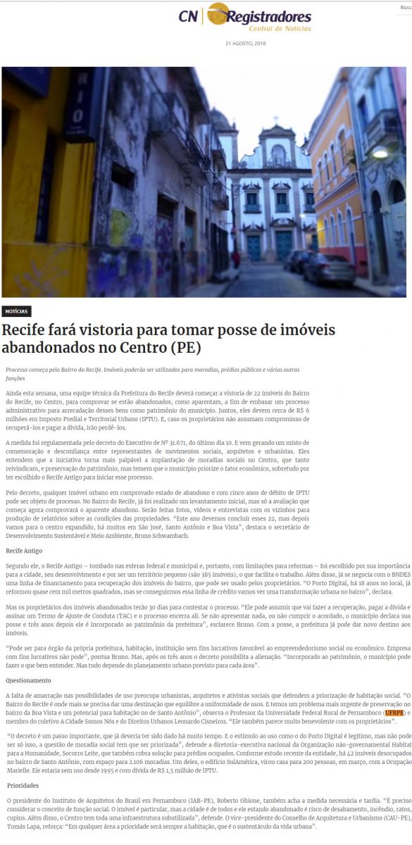 [CENTRAL DE REGISTRADORES] Recife fará vistoria para tomar posse de imóveis abandonados no Centro (PE)