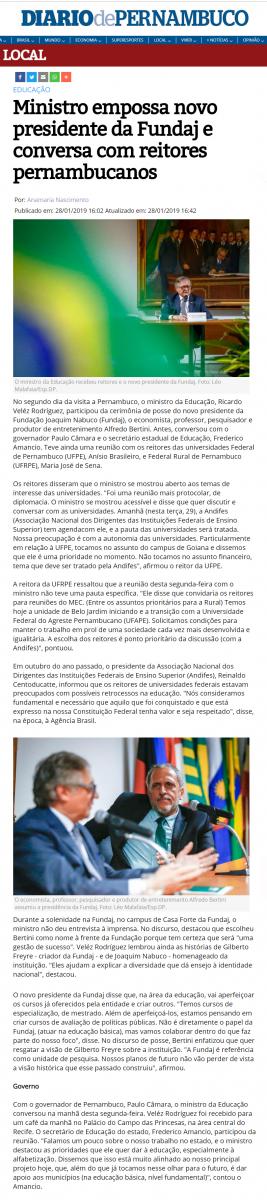 [DIÁRIO DE PERNAMBUCO] Ministro empossa novo presidente da Fundaj e conversa com reitores pernambucanos