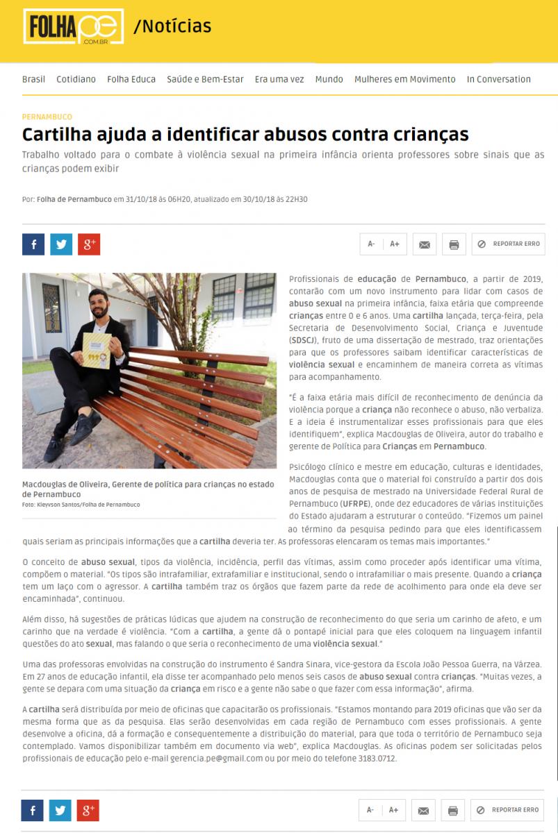 [FOLHA DE PERNAMBUCO] Cartilha ajuda a identificar abusos contra crianças