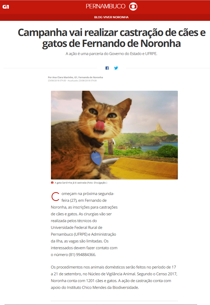 [G1] Campanha vai realizar castração de cães e gatos de Fernando de Noronha