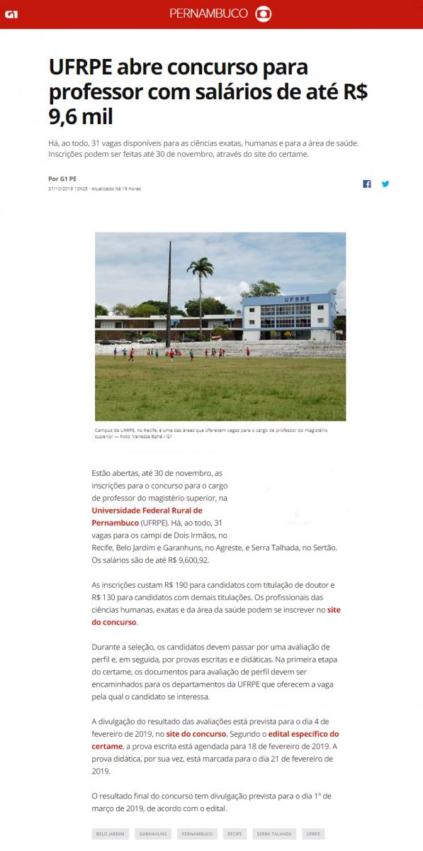 [ G1 PERNAMBUCO] UFRPE abre concurso para professor com salários de até R$ 9,6 mil