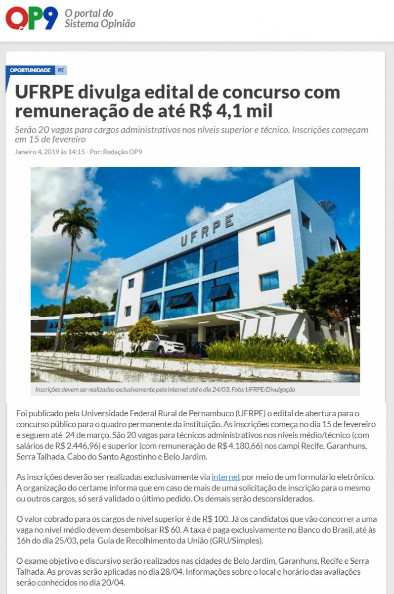 [OP9] UFRPE divulga edital de concurso com remuneração de até R$ 4,1 mil
