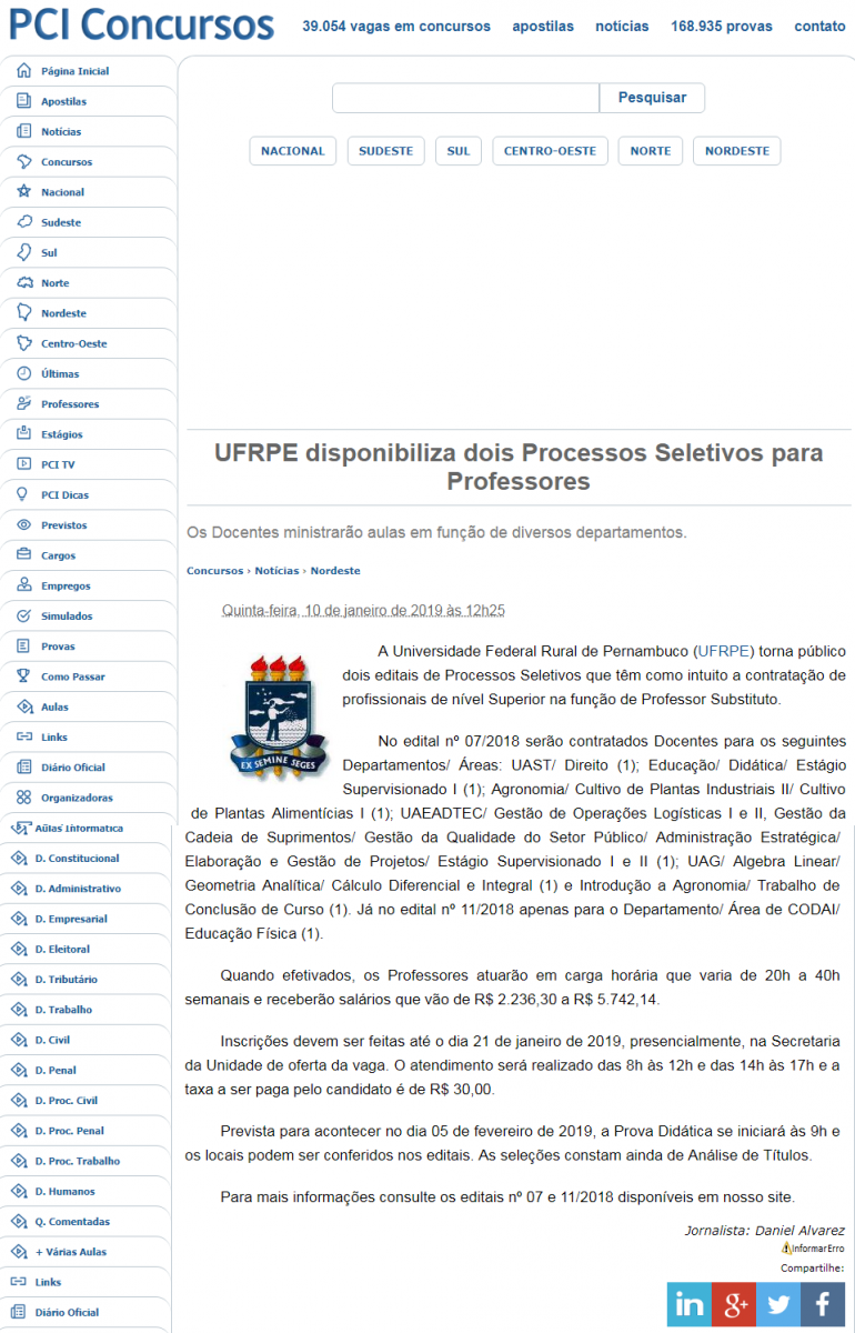 [PCI CONCURSOS] UFRPE disponibiliza dois Processos Seletivos para professores