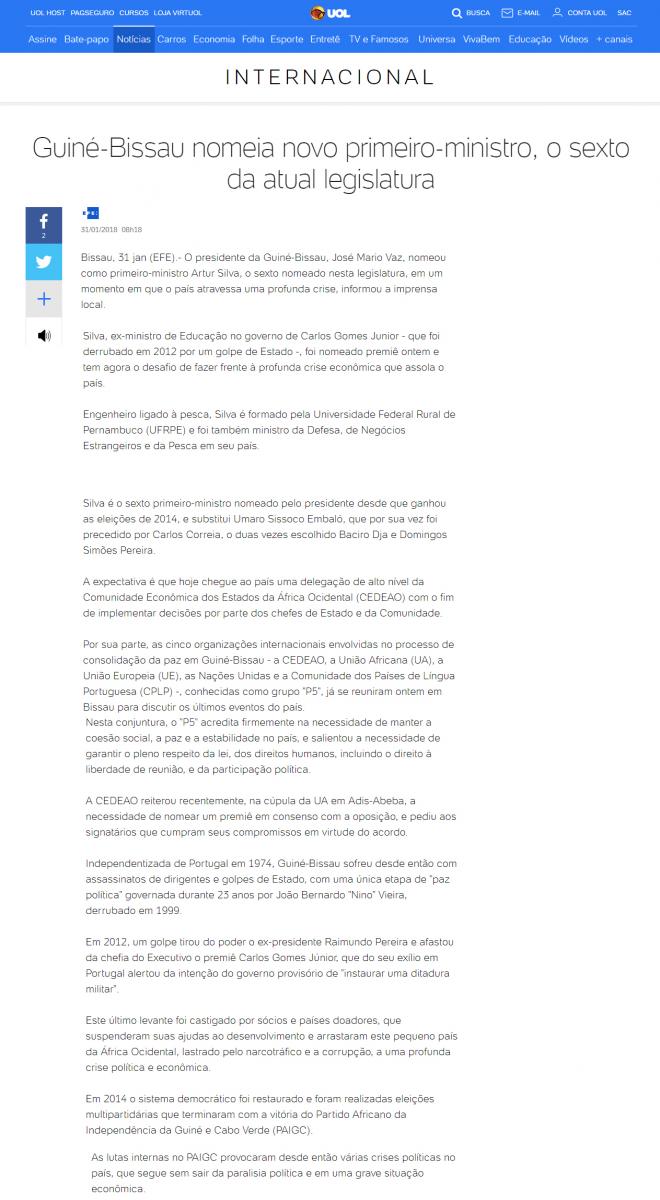[UOL] Guiné-Bissau nomeia novo primeiro-ministro, o sexto da atual legislatura