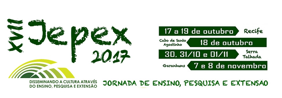 Nesta edição, a XVII Jornada de Ensino, Pesquisa e Extensão (JEPEX), maior evento acadêmico da Universidade Federal Rural de Pernambuco (UFRPE), será realizada nos diversos campi da UFRPE, com programação específica sendo realizada em Recife (Sede), Cabo de Santo Agostinho (UACSA), Garanhuns (UAG) e Serra Talhada (UAST).